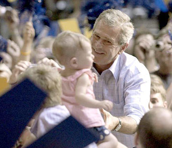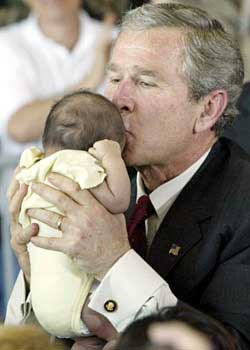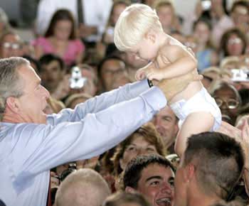 中新網(wǎng)9月5日電 據(jù)英國媒體報道,四年一度的美國總統(tǒng)大選是美國政治活動中最重要的節(jié)目。不論是共和黨,還是民主黨的總統(tǒng)候選人都會想盡一切辦法在選民面前展示自己的良好形象和領導能力。對于他們來說,選民們的“可愛貝貝”是表現(xiàn)其親和力的重要工具。以上就是媒體捕捉到的布什總統(tǒng)在競選活動中拿“可愛貝貝”作秀的精彩鏡頭。(固山)