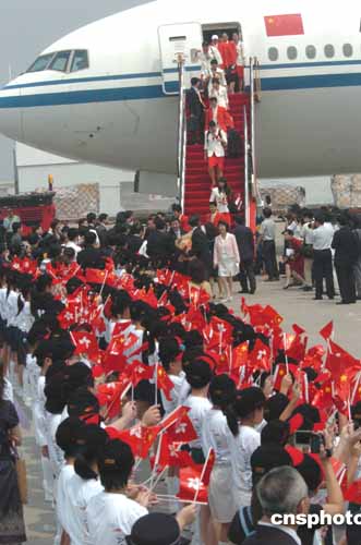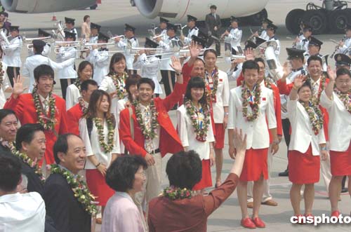 中國奧運金牌代表團在機場受到熱烈歡迎。中新社記者:錢興強