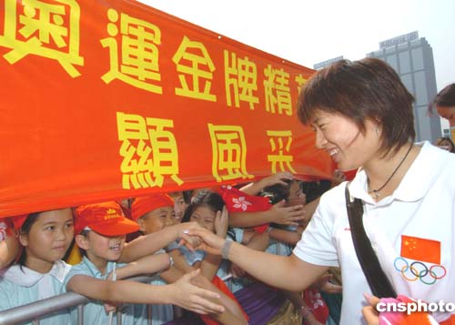 中國(guó)奧運(yùn)金牌運(yùn)動(dòng)員展開訪港第二日行程,今日早上他們分別前往金紫荊廣場(chǎng)、星光大道、沙田大會(huì)堂和青馬大橋等地參觀。這些魅力十足的體壇明星所到之處,受到大批市民的夾道歡迎,在香江掀起陣陣追星熱潮。一邊是香港的絕佳名勝,另一邊是不斷揮動(dòng)的國(guó)旗、區(qū)旗和陣陣歡呼聲,運(yùn)動(dòng)員們由衷地贊嘆:“香港很美,香港市民的熱情更令人感動(dòng)!”
