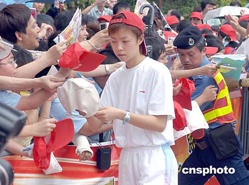 隨后,劉翔和田亮等一批運(yùn)動(dòng)員前往尖沙嘴的星光大道觀光,在那里同樣受到千名狂熱的市民和學(xué)生重重包圍及追捧。一些學(xué)生爭(zhēng)相向選手索取簽名,而金牌運(yùn)動(dòng)員也不讓他們失望,不時(shí)走近人群握手、簽名。拿到劉翔、田亮簽名的小學(xué)生,高興得雀躍不已。