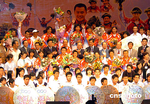 正在香港訪問的國(guó)家奧運(yùn)金牌代表團(tuán),九月七日來(lái)到香港沙田大會(huì)堂,參加新界各界慶委會(huì)舉行的歡迎國(guó)家奧運(yùn)金牌代表團(tuán)嘉年華活動(dòng)。圖為新界各界人士與到訪的部分國(guó)家奧運(yùn)金牌運(yùn)動(dòng)員一起合影。中新社記者:錢興強(qiáng)