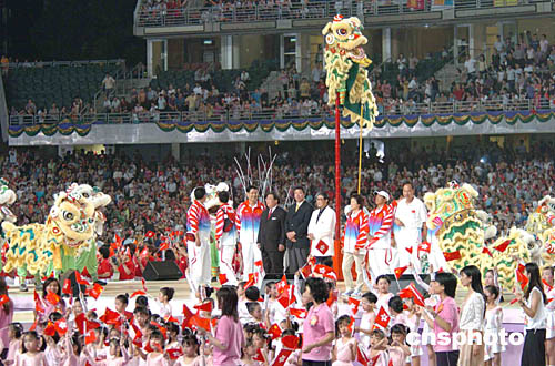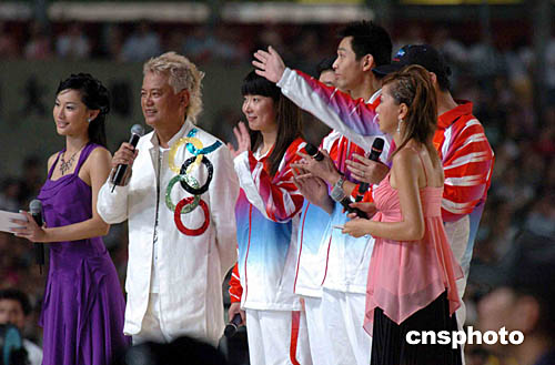 隨著金龍飛舞、銀獅歡躍,第一輛載著奧運金牌選手的高爾夫球車駛?cè)胂愀鄞笄驁,“中國人的驕傲──奧運金牌精英大匯演”,在逾三萬觀眾雷鳴潮涌般的歡呼聲中拉開了帷幕。中國奧運金牌選手與香港當(dāng)紅演藝明星的夢幻組合,使今晚的香港大球場成為激情四溢、歡樂無盡的海洋。