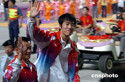 而當(dāng)震驚了世界的“黃色閃電”男子一百一十米欄冠軍劉翔,唱著《好想好想》登臺時,全場又一次掀起歡呼的高潮。一對中學(xué)女生一邊興奮地叫著劉翔的名字,一邊揮著手中的小紅旗。“我們來就是想見劉翔,他好靚仔呵,可不可以幫我們找他簽個名?”她們手中拿著一張劉翔的照片,已經(jīng)問過好幾個匯演工作人員。“好想,好想……”這歌聲會使許多人想問,眼下,劉翔最想實現(xiàn)的夢是什么,他的目標(biāo)是不是已經(jīng)鎖定四年后在北京舉行的奧運會金牌?