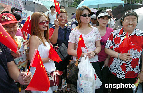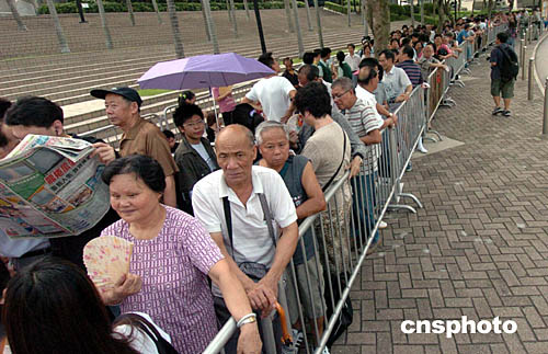 由五十位中國奧運(yùn)金牌選手和香港當(dāng)紅藝人聯(lián)袂奉獻(xiàn)的大匯演定于晚間七點(diǎn)正式開始,但不到下午三點(diǎn),匯演地點(diǎn)大球場外已經(jīng)有超過二百名香港市民冒酷暑、頂烈日在排隊“霸位”。他們個個“裝備齊全”,帶了水、遮陽傘和面包點(diǎn)心,說起來看奧運(yùn)健兒表演,都有掩飾不住的喜悅與興奮之情。