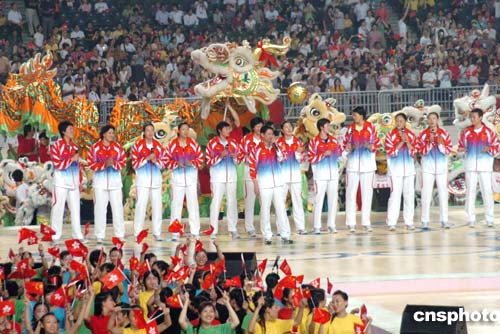 9月7日晚上,位于快活谷的香港大球場(chǎng)成為名副其實(shí)的“歡樂(lè)之谷”,國(guó)家?jiàn)W運(yùn)金牌選手和數(shù)萬(wàn)名香港市民會(huì)聚在此,共享中國(guó)在雅典奧運(yùn)會(huì)奪金的喜悅和榮光!皧W運(yùn)精英大匯演”在這里拉開(kāi)帷幕。圖為女排教練陳忠和帶領(lǐng)全體選手高歌,為晚會(huì)推向高潮。作者:洪少葵
