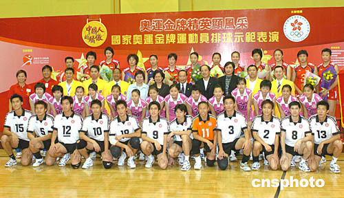 中國女子排球隊8日來到香港修頓體育館進行表演﹐與香港男女排球隊合影留念。中新社記者:趙振清