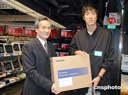 國家奧運(yùn)選手在香港展開訪港行程,9月8日,部分金牌選手到尖沙咀海港城海洋中心選購總值十多萬元電器產(chǎn)品。圖為劉翔與百老匯代表合影。作者:洪少葵