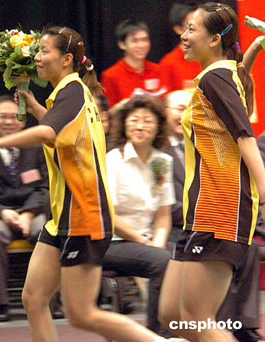 為歡迎國家奧運金牌代表團訪港,九月八日香港舉行“中國人的驕傲--奧運金牌精英顯風(fēng)采”奧運金牌羽毛球及乒乓球表演。圖為奧運羽毛球金牌運動員將鮮花拋向看臺觀眾。中新社記者:錢興強