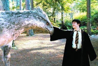 在第三集中,最容易令人留下深刻印象的可以說(shuō)是半鳥(niǎo)半馬的鷹頭馬身有翼獸,電影制作組足足花了1年時(shí)間來(lái)研究鷹頭馬身有翼獸的外形,極花心思。當(dāng)鷹頭馬身有翼獸飛行時(shí),它身上的毛和真正雀鳥(niǎo)羽毛的擺動(dòng)無(wú)異,花了制作組人員不少心血。鷹頭馬身有翼獸被鎖在一個(gè)種滿南瓜的綠園內(nèi),它是哈利、赫敏及羅恩的好朋友,為他們解決疑難。