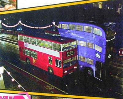 哈利在片中會(huì)登上一部外表跟普通倫敦巴士無(wú)異,但其實(shí)由魔法控制走動(dòng)的“騎士巴士”。怪巴士用上一輛已“退休”的普通巴士加建一層而成,拍攝時(shí)以時(shí)速30公里駕駛,而路面上其他車輛則以時(shí)速8公里行走,再加上路上的特技人受過(guò)特別的走路訓(xùn)練(較正常步速慢),讓巴士在馬路上看來(lái)飛馳得特別快。