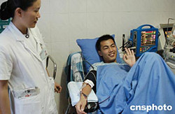年僅十九歲、現(xiàn)就讀于廈門(mén)南洋學(xué)院的在校大學(xué)生張良建(右一),九月九日在福建醫(yī)科大學(xué)附屬協(xié)和醫(yī)院輸血科干細(xì)胞采集室內(nèi)接受造血干細(xì)胞采集,引起有關(guān)專家的重視。這是迄今為止福建省首例在校大學(xué)捐獻(xiàn)造血干細(xì)胞。據(jù)了解,福建省現(xiàn)有十三萬(wàn)名患者等待造血干細(xì)胞移植,每年新增白血病患者約一千二百人。作者:劉可耕