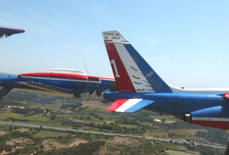 法國空軍的“法蘭西巡邏兵”飛行表演隊(duì)正式成立于1964年2月。飛行表演隊(duì)的飛機(jī)涂著同法國國旗一樣的紅、白、藍(lán)三種顏色,機(jī)群在空中做飛行表演時(shí)也常常把著三種顏色的煙跡留在空中。它象征著“自由”(紅色)、“民主”(白色)、“博愛”(藍(lán)色),體現(xiàn)了法國人民勇敢、浪漫的傳統(tǒng)和對(duì)未來美好的愿望。圖為飛行表演隊(duì)正在作精彩的飛行表演(來源:艦船知識(shí)網(wǎng)絡(luò)版)