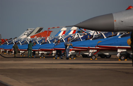 法國空軍的“法蘭西巡邏兵”飛行表演隊正式成立于1964年2月。飛行表演隊的飛機涂著同法國國旗一樣的紅、白、藍三種顏色,機群在空中做飛行表演時也常常把著三種顏色的煙跡留在空中。它象征著“自由”(紅色)、“民主”(白色)、“博愛”(藍色),體現了法國人民勇敢、浪漫的傳統(tǒng)和對未來美好的愿望。圖為表演結束后地勤人員正在作例行檢查和維修(來源:艦船知識網絡版)