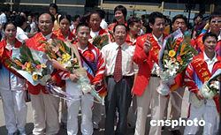 九月十三日上午,在第二十八屆雅典奧運會上取得一金二銀一銅歷史最好成績的閩藉部分獲獎運動員石智勇(前排左三)、吳美錦(前排右一)、黃珊汕(前排左一),教練員陳忠和(前排右二)、陳文斌(前排左二)等從北京載譽返閩抵達(dá)福州長樂國際機場,受到福建省各界人士的熱烈歡迎。作者:劉可耕