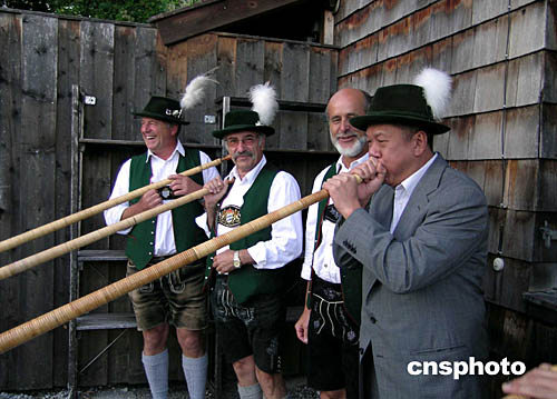 十三日傍晚﹐澳門特首何厚鏵結(jié)束了對德國巴伐利亞州一天的參觀訪問后來到阿爾卑斯山腳下游覽﹐當?shù)厮嚾舜灯饌鹘y(tǒng)的阿爾卑斯號角歡迎客人。對長長的號角﹐眾人皆不得其法﹐只有何厚鏵信手拈來即能吹響。作者:孫兆震