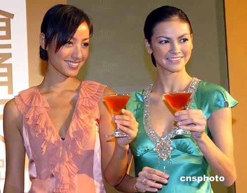 香港名模蔣怡(左)﹑Rosemary14日出席香港時(shí)代廣場(chǎng)“時(shí)代b2”開業(yè)儀式。