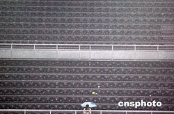 九月十五日晚,由于再次下雨,在北京網(wǎng)球中心的中央球場進行的中國網(wǎng)球公開賽ATP男子單打比賽被迫推遲,但有癡心的女球迷仍在雨中坐在觀眾席上不肯離去,等待雨停后繼續(xù)觀看比賽。中新社記者:盛佳鵬