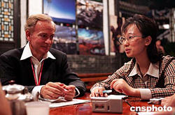 中法兩國文化交流日益密切。九月十七日,法國駐華大使館文化專員白尚化(左)在與中新社記者交談平遙國際攝影大展的所見所聞。作者:張?jiān)?