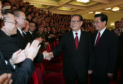 講話后,胡錦濤、江澤民親切握手,并向大家揮手致意,全場再次響起長時(shí)間的熱烈掌聲。