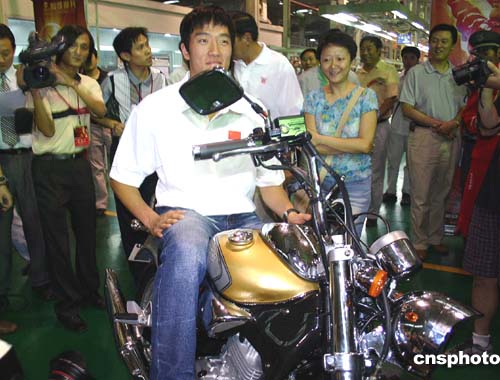 重慶隆鑫工業(yè)集團(tuán)把下線的第一輛“翔系列”摩托車贈(zèng)與劉翔。作者:郭晉嘉