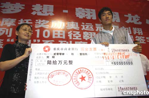 重慶隆鑫控股有限公司副總裁楊曉雯女士向劉翔頒發(fā)獎(jiǎng)金六十萬(wàn)元人民幣。作者:郭晉嘉