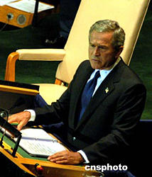 美國總統(tǒng)布什繼巴西總統(tǒng)盧拉后第二個發(fā)言,這也是聯(lián)大一般性辯論的慣例。布什繼續(xù)向國際社會宣傳伊拉克戰(zhàn)爭的必要性,說伊拉克戰(zhàn)爭是為了世界的和平與公正,因為伊拉克始終沒有全面遵守安理會的有關(guān)決議,所以必須承擔(dān)嚴(yán)重后果。布什還慷慨解囊,提議在聯(lián)合國建立“民主基金”,許諾美國將首先給予資助,他認(rèn)為“民主基金”將幫助一些國家建立法律法規(guī)、獨立的法庭、自由出版物、政黨和貿(mào)易聯(lián)盟,并由此打下民主的基礎(chǔ)。