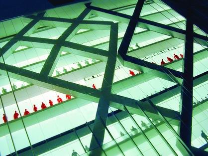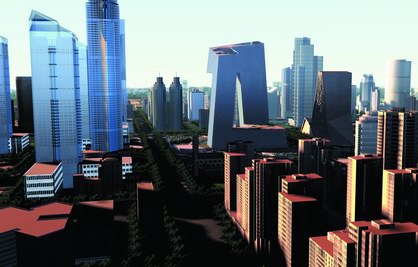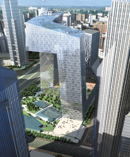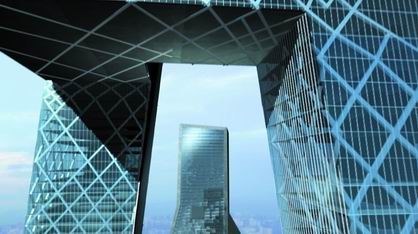 CCTV主樓的兩個塔樓從一個共同的平臺升起,在上部匯合,形成三維體驗,突破了摩天樓常規(guī)的豎向特征的表現(xiàn)。復(fù)雜的功能包容在內(nèi)部緊密連接的環(huán)路中,體現(xiàn)一個相互合作、相互依存的鏈條以及自身組織的有序和協(xié)調(diào)。