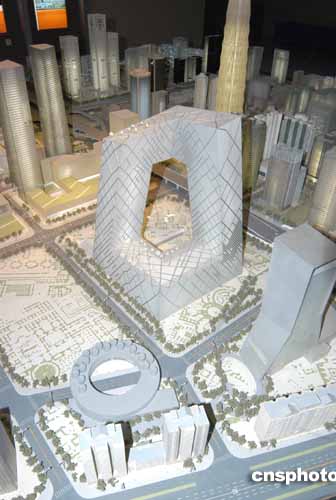 經(jīng)過多次反復(fù)和調(diào)整,占地近十九公頃的中央電視臺新大樓于九月二十二日在北京CBD奠基,正式從設(shè)計圖紙轉(zhuǎn)入建設(shè)期。新大樓的方案由荷蘭大都會建筑事務(wù)所著名設(shè)計師庫哈斯設(shè)計,“側(cè)面S正面O”的特異造型此前引起眾多爭議。建成后每天將有超過一萬名員工在樓內(nèi)工作,可以容納約二百五十個頻道。圖為央視新樓及周邊地區(qū)效果模型。作者:徐曦弋