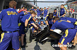 九月二十六日F1中國大獎(jiǎng)賽將在上海國際賽車場(chǎng)舉行。連日來,參賽車隊(duì)積極做好各項(xiàng)充分準(zhǔn)備。圖為英美車隊(duì)加緊練習(xí)如何快速維修賽車。作者:潘索菲