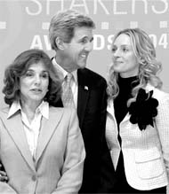 日前,她出席了紐約一個(gè)名為第七屆全年“RedbookMothersand-Shakers”大獎(jiǎng),接受大會(huì)頒贈(zèng)的獎(jiǎng)項(xiàng)。同一場合,與現(xiàn)任美國總統(tǒng)布什競逐下任美國總統(tǒng)的克里(圖中)也有出席,還與這位巨星一同合照。(鐵巖)