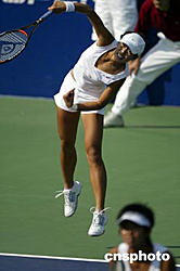 九月二十五日,中國(guó)網(wǎng)球公開(kāi)賽女子雙打比賽繼續(xù)在北京網(wǎng)球中心進(jìn)行,在中央球場(chǎng)進(jìn)行的女雙半決賽中,中國(guó)選手、雅典奧運(yùn)會(huì)起網(wǎng)球女雙冠軍李婷和孫甜甜(后)不敵俄羅斯選手薩芬娜與瑞士選手加格里亞蒂組合,無(wú)緣晉級(jí)決賽。中新社記者:盛佳鵬