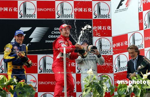 九月二十六日,法拉利車隊(duì)的巴里切羅(中)以一小時(shí)二十九分十二秒四二零的成績(jī)?cè)谏虾Z得F1歷史上首個(gè)中國(guó)大獎(jiǎng)賽的冠軍。英美車手巴頓(左)取得本站比賽亞軍,雷克南取得第三。法拉利一號(hào)車手舒馬赫在本站比賽厄運(yùn)連連,在比賽中發(fā)生兩次意外,最后僅獲第十二。作者:潘索菲