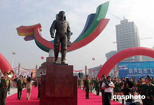 中國航天英雄楊利偉雕像二十七日在家鄉(xiāng)遼寧省葫蘆島市飛天廣場落成,該廣場由中國雕塑家協(xié)會設(shè)計和制作,包括楊利偉寫實全身像、“飛”字抽象主雕、九天柱石雕等六組大型雕塑。中新社記者:錢興強