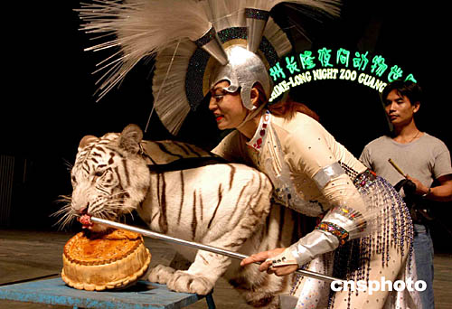 九月二十七日,廣州長(zhǎng)隆夜間動(dòng)物世界的動(dòng)物提前過(guò)了一個(gè)妙趣橫生的中秋節(jié)。威猛的白老虎守著專(zhuān)門(mén)為它制作的大月餅大快朵頤。作者:劉衛(wèi)勇