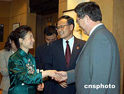 中國駐紐約總領(lǐng)館九月二十七日中午舉辦中華人民共和國建國五十五周年招待會(huì)。圖為紐約總領(lǐng)事劉碧偉(中)和夫人方淳(左)歡迎俄羅斯駐紐約總領(lǐng)事加莫林(右)出席招待會(huì)。作者:陳建