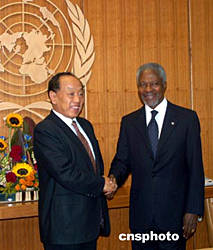 李肇星表示中國(guó)將繼續(xù)致力于加強(qiáng)聯(lián)合國(guó)作用和權(quán)威,支持聯(lián)合國(guó)的改革。安南高度贊賞中國(guó)在國(guó)際事務(wù)中的作用,感謝中國(guó)對(duì)聯(lián)合國(guó)各領(lǐng)域工作的支持。