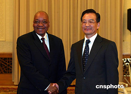中新社北京九月二十八日電 中國全國人大常委會委員長吳邦國和國務院總理溫家寶今天分別在人民大會堂會見了南非副總統(tǒng)雅各布·祖馬。