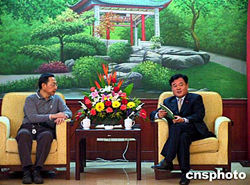 湖南省副省長(zhǎng)賀同新(右)九月三十日在長(zhǎng)沙會(huì)見全國(guó)政協(xié)委員、香港興業(yè)集團(tuán)董事會(huì)副主席查懋聲一行。查懋聲來湘是為了考察湖南株洲市一個(gè)總投資額近七億元的房地產(chǎn)項(xiàng)目。作者:鄧霞