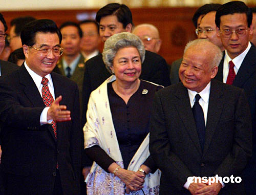 中國(guó)國(guó)家主席胡錦濤、全國(guó)人大常委會(huì)委員長(zhǎng)吳邦國(guó)、國(guó)務(wù)院總理溫家寶、全國(guó)政協(xié)主席賈慶林等與柬埔寨西哈努克國(guó)王和王后出席招待會(huì)。