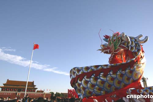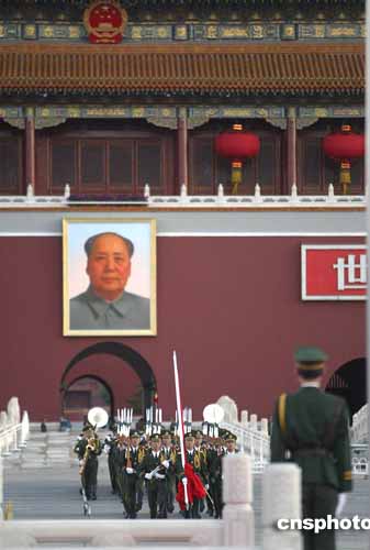 而另一位表情同樣親和的偉人,孫中山先生,其像在城樓對面廣場上矗立。來自北京各高校及其他各界人士,此時正在廣場歡歌起舞。一小時半前,他們剛剛在此觀看了升旗儀式。那一刻,近處奧運倒計時器的顯示為一千四百零七天十二小時零五十一分鐘。