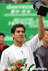 中新社上海十月三日電(劉立濤)上海喜力網(wǎng)球公開賽男子單打決賽,今天下午在阿根廷選手卡納斯與德國(guó)人博格斯穆勒之間展開?{斯最后以二比零擊敗對(duì)手奪得冠軍,這也是他今年獲得的第三個(gè)ATP冠軍頭銜。