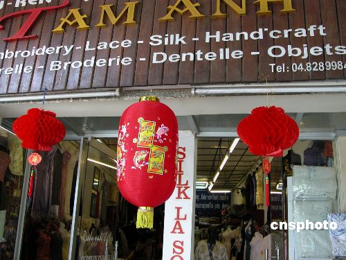越南文化與漢文化有千年情結(jié)。越語中漢文化的影響首先是越南的姓氏,越南人大都有一個漢語化的姓再加上一個名。此外,越南人至今保持著過端午節(jié)、春節(jié)的習俗。圖為河內(nèi)街頭的一家服裝店門口掛著大紅的燈籠,燈籠上寫著“年年有余”的漢字。吳慶才 攝