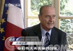 記者水均益:這里是法國首都巴黎,凱旋門、香榭麗舍大道以及在我前方的協(xié)和廣場和盧浮宮,這些都是法蘭西這個美麗的歐洲國家的靈魂體現(xiàn)。80多年前,周恩來、鄧小平、朱德等新中國的創(chuàng)立者們來到法國,尋找革命的真理;40年前法國總統(tǒng)戴高樂在愛麗舍宮作出決定,與新中國建立正式的外交關系,法國成為第一個與中華人民共和國建立大使級外交關系的西歐大國。40年過去了,無論世界風云如何變幻,中法兩國的關系始終朝著健康、良好的方向發(fā)展。10月8號,法國總統(tǒng)希拉克將對我國進行第五次訪問。我們現(xiàn)在就走進愛麗舍宮,對臨行前的希拉克總統(tǒng)進行獨家專訪,聽聽這位法國領導人如何看待當今的中法關系和我們所處的這個世界。