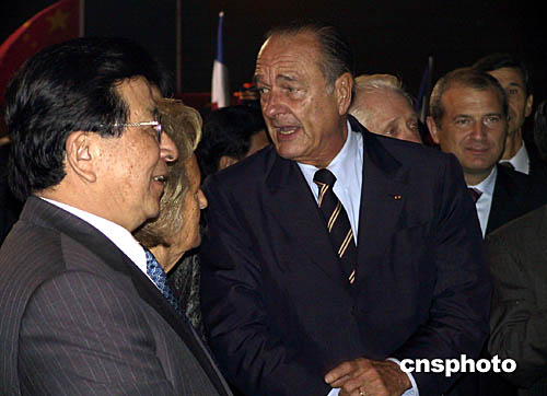 法蘭西共和國總統(tǒng)雅克·希拉克一行于八日晚22時抵達訪華首站--四川省成都市,在雙流國際機場,受到了中國國家副主席曾慶紅、中共四川省委書記張學忠等官員的熱烈歡迎。希拉克總統(tǒng)應中國國家主席胡錦濤邀請,來華進行為期五天的國事訪問。作者:楊杰