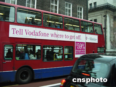 倫敦公交車車身上,赫然出現(xiàn)移動(dòng)通訊運(yùn)營(yíng)商直接點(diǎn)名挑戰(zhàn)對(duì)手的廣告。余瑞冬 攝