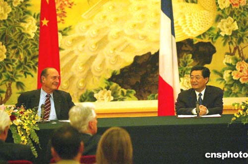 中國(guó)國(guó)家主席胡錦濤與法國(guó)總統(tǒng)希拉克十月九日在出席雙方多個(gè)合作協(xié)議的簽字儀式后,共同會(huì)見記者。中新社記者:滿會(huì)喬
