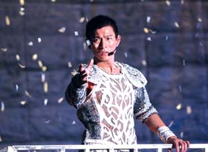在與歌迷合唱完《如果你是我的傳說》《天意》《愛不完》后,劉德華換了一身銀色武士裝,以《愛該怎么繼續(xù)》《來生緣》等歌曲串連成一出英雄救美不成的凄美愛情故事。舞臺中央先是出現(xiàn)了一條高達(dá)5米的金色眼鏡蛇,隨著音樂節(jié)奏不停地晃動,一只白色的大獅子又走了上來。劉德華為了救愛人,不時地與壞人搏斗,最后只能看著愛人被壞人帶走。孤單的華仔站到10米高的升降臺上,以《孤星淚》結(jié)束了這幕演出。站到升降臺上,華仔很興奮地與最遠(yuǎn)處歌迷打招呼,稱這是“彌補不能走到歌迷身邊的最好的辦法”。隨著高度的遞增,他坦承“有點緊張”,希望暫時終止與歌迷的交談。