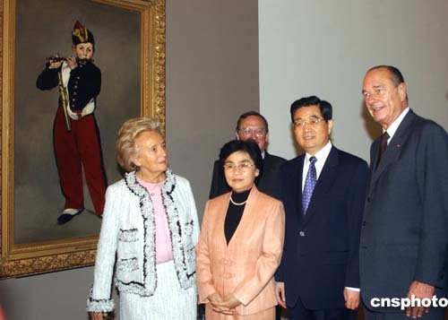 十月十日,中國國家主席胡錦濤與來訪的法國總統(tǒng)希拉克在北京參觀了中國美術(shù)館舉行的法國印象派繪畫珍品展,并在美術(shù)館前合影留念。