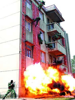 驚心動(dòng)魄的反劫持人質(zhì)“戰(zhàn)斗”打響了!5名“恐怖分子”作案后,駕駛一輛面包車劫持3名“人質(zhì)”逃竄。特勤中隊(duì)接到上級(jí)命令后,立即兵分兩路,一路在各主要路口設(shè)障攔截,一路沿“歹徒”逃離方向?qū)嵤┳窊。在走投無路的情況下,“歹徒”劫持“人質(zhì)”竄到某單位一辦公樓。在雙方對(duì)峙不下時(shí),根據(jù)上級(jí)指示,特勤中隊(duì)采取強(qiáng)行突擊。說時(shí)遲,那時(shí)快,一聲巨響后,戰(zhàn)士們空中突降,從窗口魚躍而入,隨著幾聲槍響,“歹徒”們死的死,傷的傷,全被制服,3名“人質(zhì)”安然無恙,演練場(chǎng)內(nèi)再次掌聲如潮……