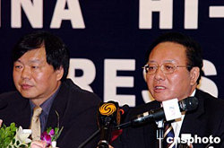 十月十一日下午,第六屆中國國際高新技術成果交易會組委會向媒體記者發(fā)布信息,有來自加拿大、俄羅斯、美國、德國、韓國等二十一個國家和國際組織組團參加本次盛會。圖為商務部副部長魏建國(右)信息產業(yè)部副部長婁勤儉向記者發(fā)布“高交會”信息。作者:陳文